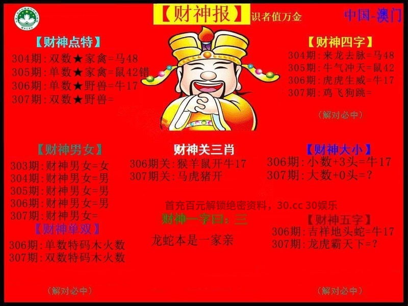 | 307期:【前后四肖】开:狗20准 前【蛇虎兔龙】后【马鸡狗羊】 |